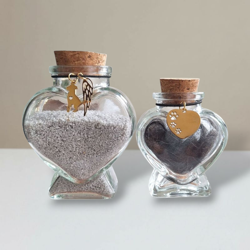 Onze memorial flesjes in hartvorm zijn kleine glazen urntjes waarmee je op een persoonlijke en respectvolle manier de herinnering aan jouw huisdier kunt bewaren. Ze bieden ruimte voor een klein beetje as, een plukje vacht of een ander dierbaar aandenken. Door hun vorm en uitstraling zijn ze een liefdevol symbool van de band die je deelt met je maatje. Een hartvormig flesje wordt ook vaak gekozen als aanvulling op een urn hond of urn kat, wanneer je naast een grotere herinneringsplek ook iets kleins dichtbij wilt houden.