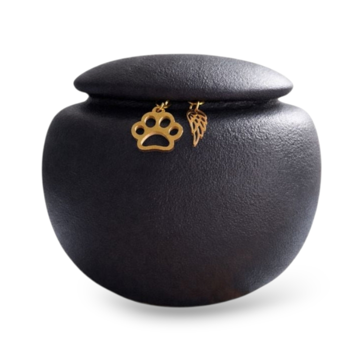 Deze stijlvolle zwarte urn is ideaal om de as van jouw geliefde huisdier veilig te bewaren. Gemaakt van hoogwaardig keramiek, past deze urn prachtig in elk interieur. De deksel is eenvoudig te openen om de urn te vullen. Daarnaast ontvang je twee goudkleurige deepsake hangers, die je naar wens aan de urn kunt bevestigen of verwijderen.