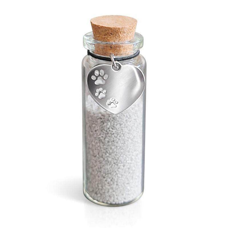 Een subtiel memorial flesje waarin je een klein beetje as kunt bewaren, snorhaartjes of een plukje haar als tastbaar aandenken. Ideaal voor een herdenkingsplekje in huis. Met een keepsake hangertje voor een liefdevolle afwerking.