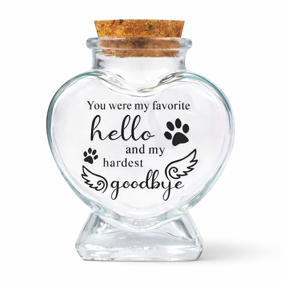 Een troostrijk herdenkingsflesje met de ontroerende tekst:  "You were my favorite hello and my hardest goodbye". Geschikt voor een klein hoeveelheid as van je kat of hond, of een ander persoonlijk aandenken. Klein van formaat, groot in betekenis, een liefdevol aandenken voor altijd.