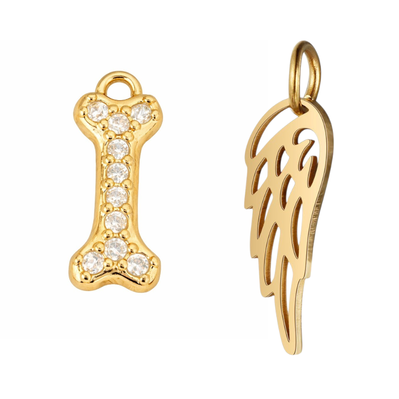 • Goudkleurige hangers: botje met zirkoniasteentjes en engelenvleugel