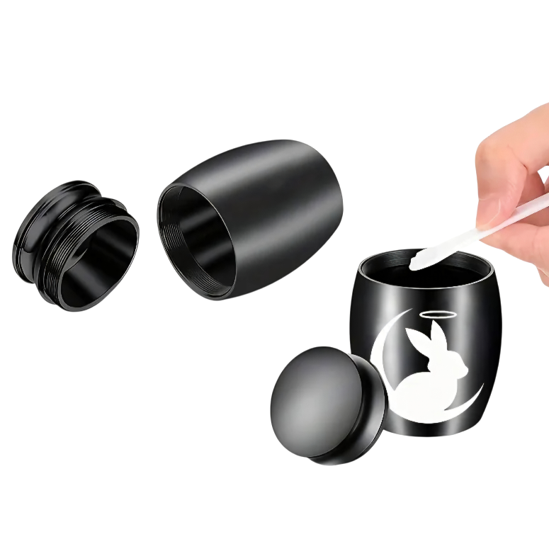 Deze kleine, stijlvolle mini-urn is een liefdevol aandenken aan je konijn. Het matte zwarte in combinatie met het witte silhouet van een konijntje in de maan, is een subtiele manier om je dierbare maatje dichtbij te houden. Het urntje kan worden voorzien van een persoonlijke gravure, zoals een naam en een datum op de achterkant of op deksel.